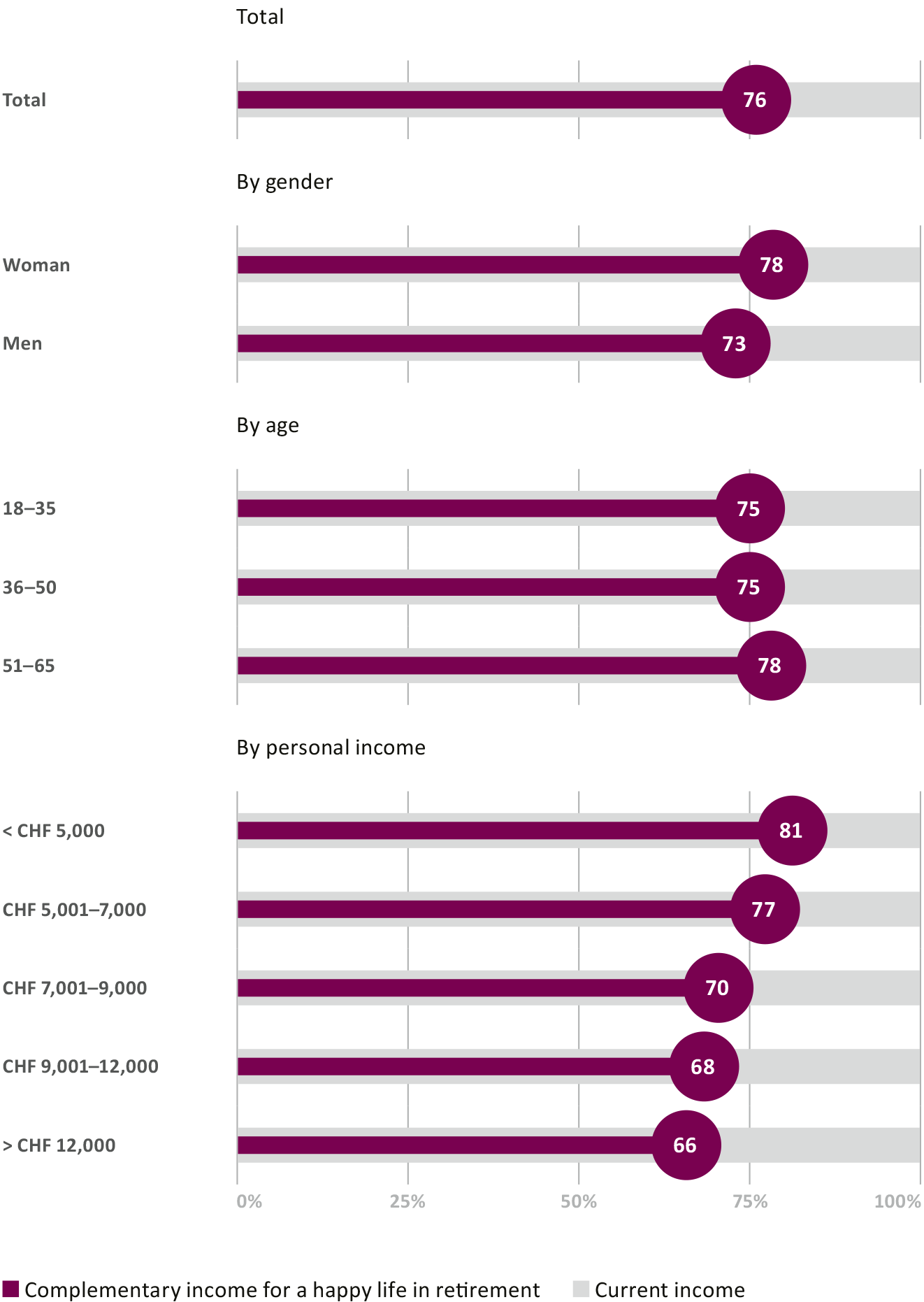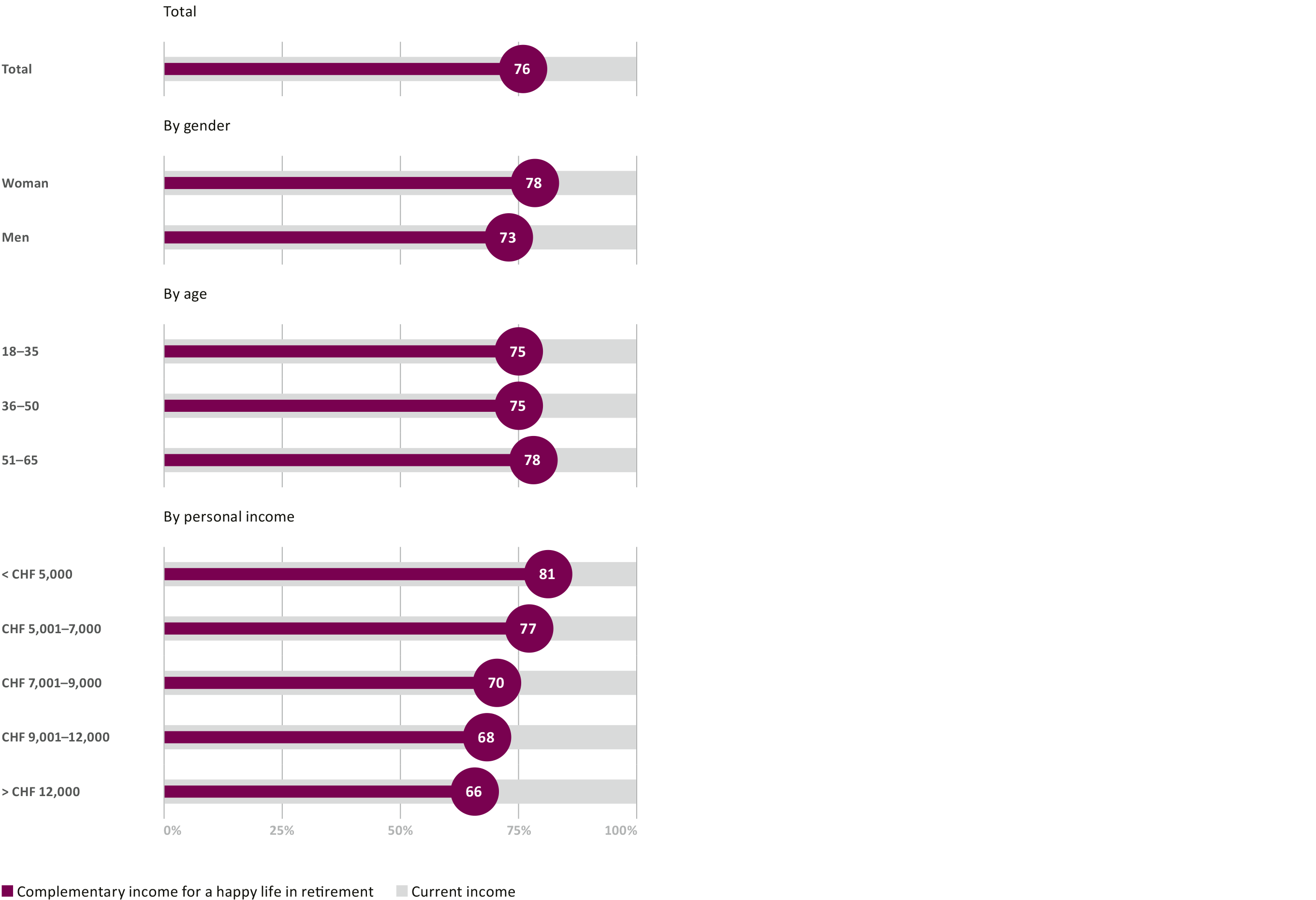 According to the survey, the Swiss population will, on average, need 76 percent of their current income after retirement to be "completely satisfied." However, the state and occupational retirement provision, pillars 1 and 2, are not sufficient to enable this: according to the goal defined by the Confederation, these two pillars together should generate around 60% of a person's final gross income after retirement. Depending on the individual situation, this value can sink lower, as low as 50 percent, for example. Factors such as the period of low interest rates over previous years, inflation, and redistribution can result in a scenario whereby the longer a person saves, the less likely they are to reach the 60 percent target with pillars 1 and 2. For many, there is an increasing gap between dream and reality. This can only be closed if people consistently make voluntary provision for their retirement by paying into the 3rd pillar. Consequently, it is enormously important to raise awareness for these connections within retirement provision – to ensure that people can set the right financial course for their future.