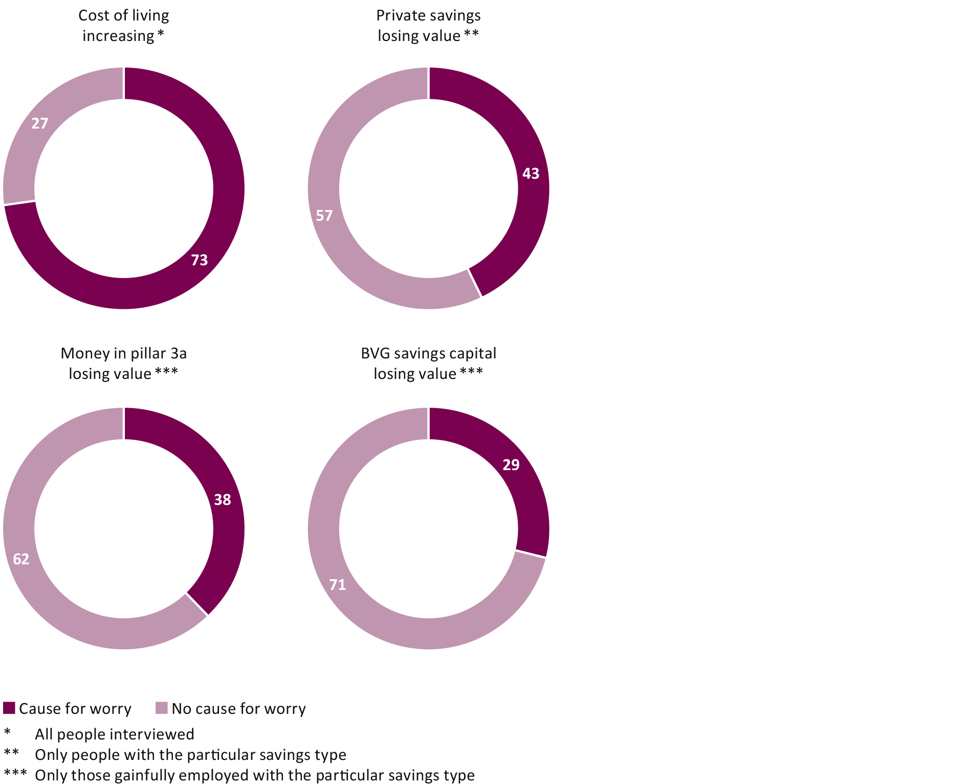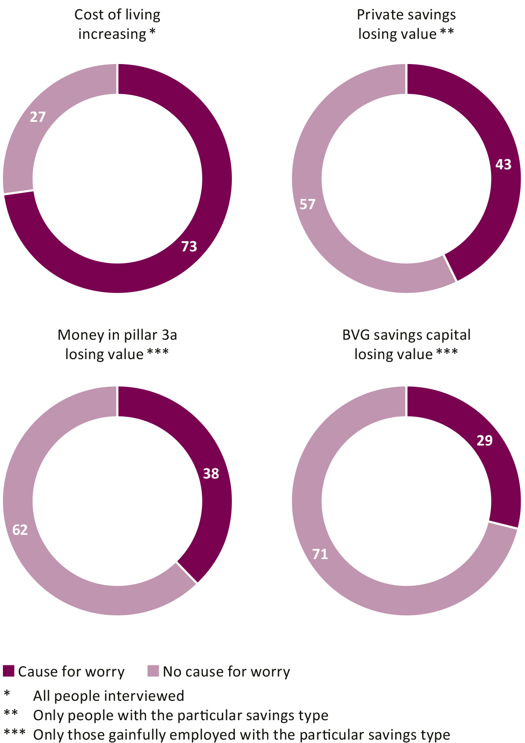 At 2.8 percent, average annual inflation in Switzerland in 2022 reached its highest point for nearly 30 years. In addition to impacting shopping, inflation also reduces the value of financial assets, e.g. savings accounts. There is little awareness of this among the population: they are considerably more concerned about the rising cost of living (73 percent) than the devaluation of their savings (43%). A meager 29 percent of the active ensured are concerned about the loss of purchasing power of their BVG capital. A contributing factor here is that the majority of those surveyed do not consider the BVG balance as part of their assets, so the connection to this important component of personal wealth is weak. This is particularly noticeable among women: women are more frequently concerned about the loss of purchasing power than men, but are less frequently concerned about the loss of the purchasing power of their BVG savings. What's more, according to the survey, they responded less frequently to inflation and reallocated their savings to investment vehicles less often.