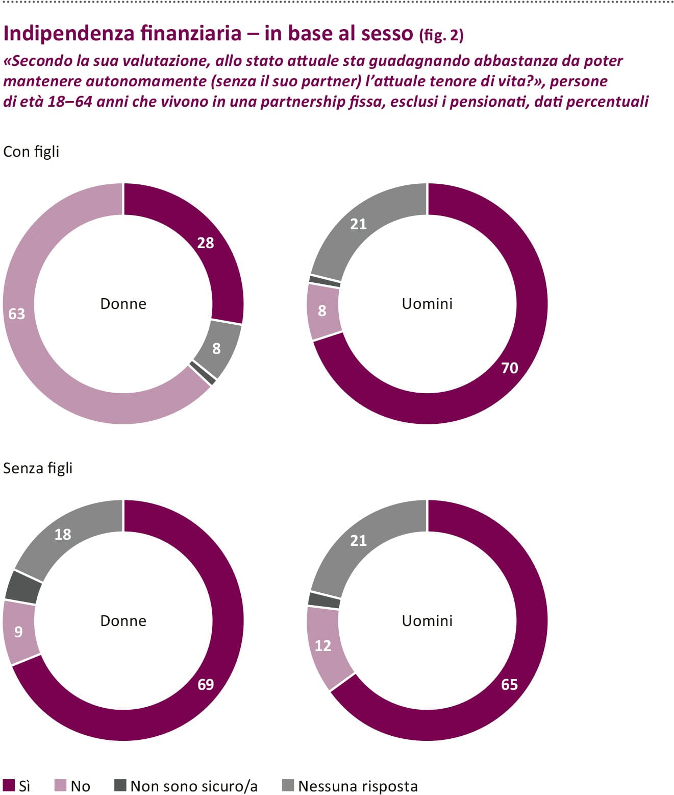 A ciò si aggiunga che due terzi delle donne con figli attualmente non sarebbero in grado di sostenersi autonomamente con il proprio reddito. Per gli uomini e le donne senza figli sono invece solo circa un quinto (vedi grafico 2).