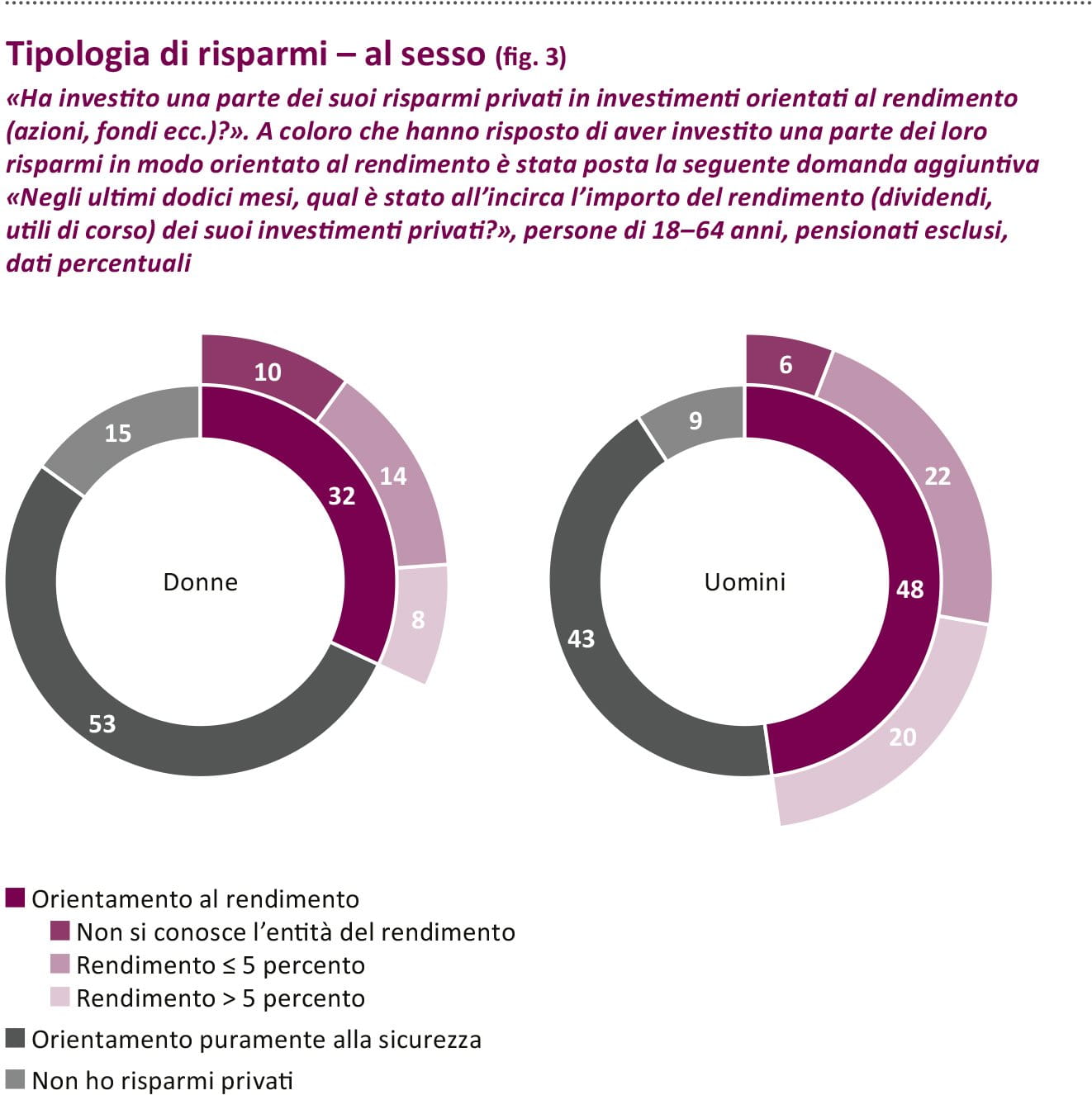 Sono soprattutto le lavoratrici a trarre vantaggio da queste informazioni: secondo lo studio, infatti, sono proprio le donne ad ammettere più spesso degli uomini di non possedere le necessarie conoscenze in materia di investimenti. Questo potrebbe essere il motivo per cui le donne tendono maggiormente a investire i loro risparmi in modalità conservativa. Mentre il 48 percento degli uomini investe i propri risparmi con orientamento al rendimento, per le donne la quota è solo del 32 percento. Le donne si affidano quindi maggiormente a prodotti finanziari incentrati sul mantenimento dei risparmi.