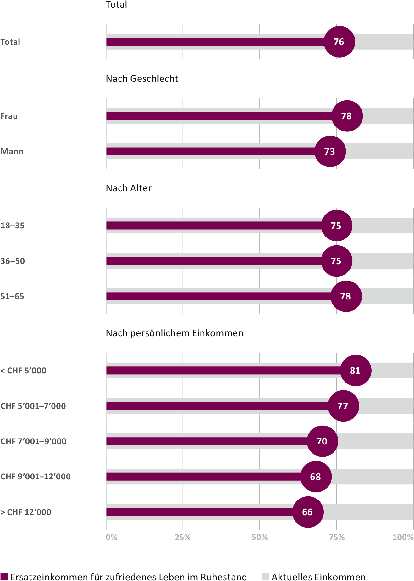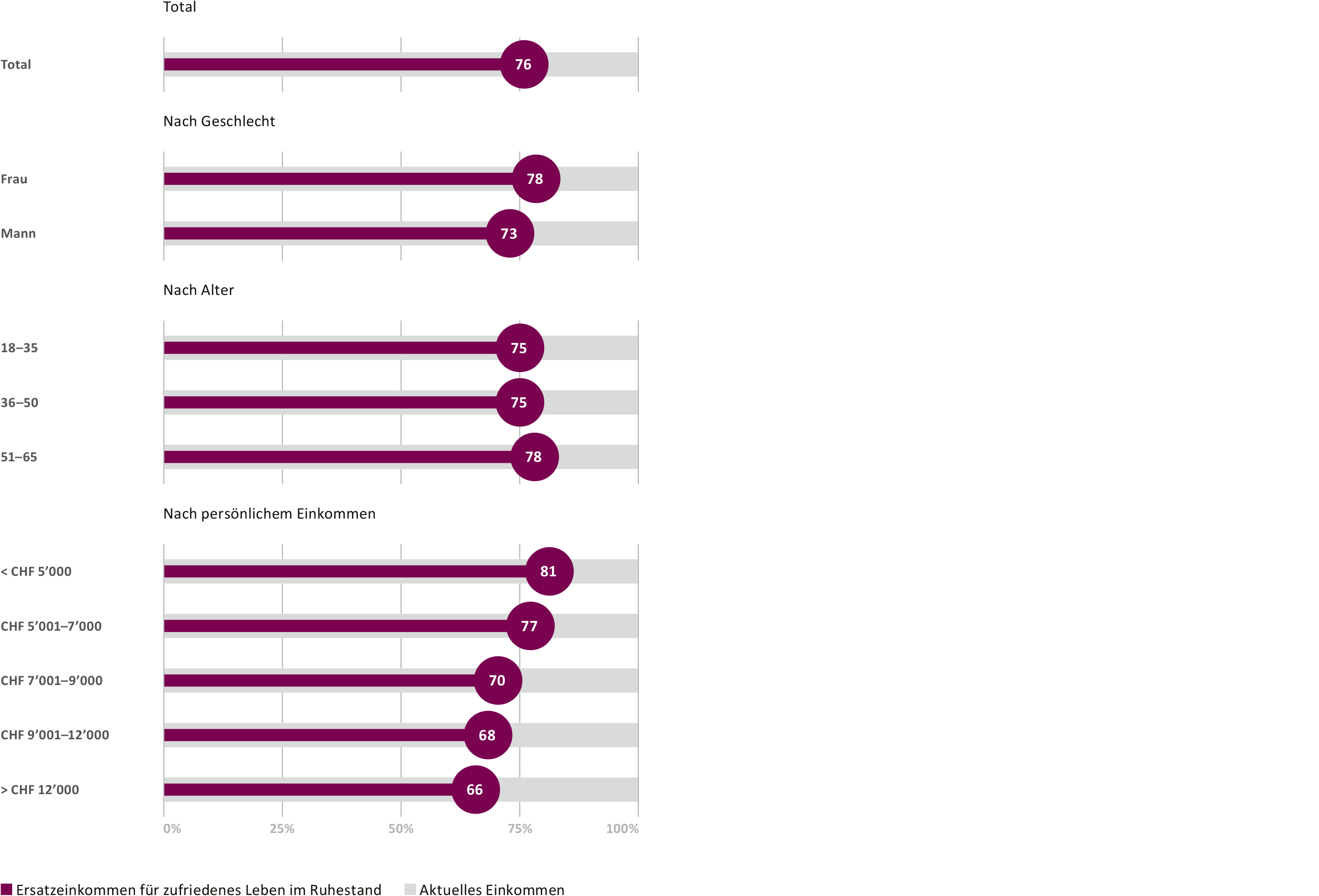 According to the survey, the Swiss population will, on average, need 76 percent of their current income after retirement to be "completely satisfied." However, the state and occupational retirement provision, pillars 1 and 2, are not sufficient to enable this: according to the goal defined by the Confederation, these two pillars together should generate around 60% of a person's final gross income after retirement. Depending on the individual situation, this value can sink lower, as low as 50 percent, for example. Factors such as the period of low interest rates over previous years, inflation, and redistribution can result in a scenario whereby the longer a person saves, the less likely they are to reach the 60 percent target with pillars 1 and 2. For many, there is an increasing gap between dream and reality. This can only be closed if people consistently make voluntary provision for their retirement by paying into the 3rd pillar. Consequently, it is enormously important to raise awareness for these connections within retirement provision – to ensure that people can set the right financial course for their future.