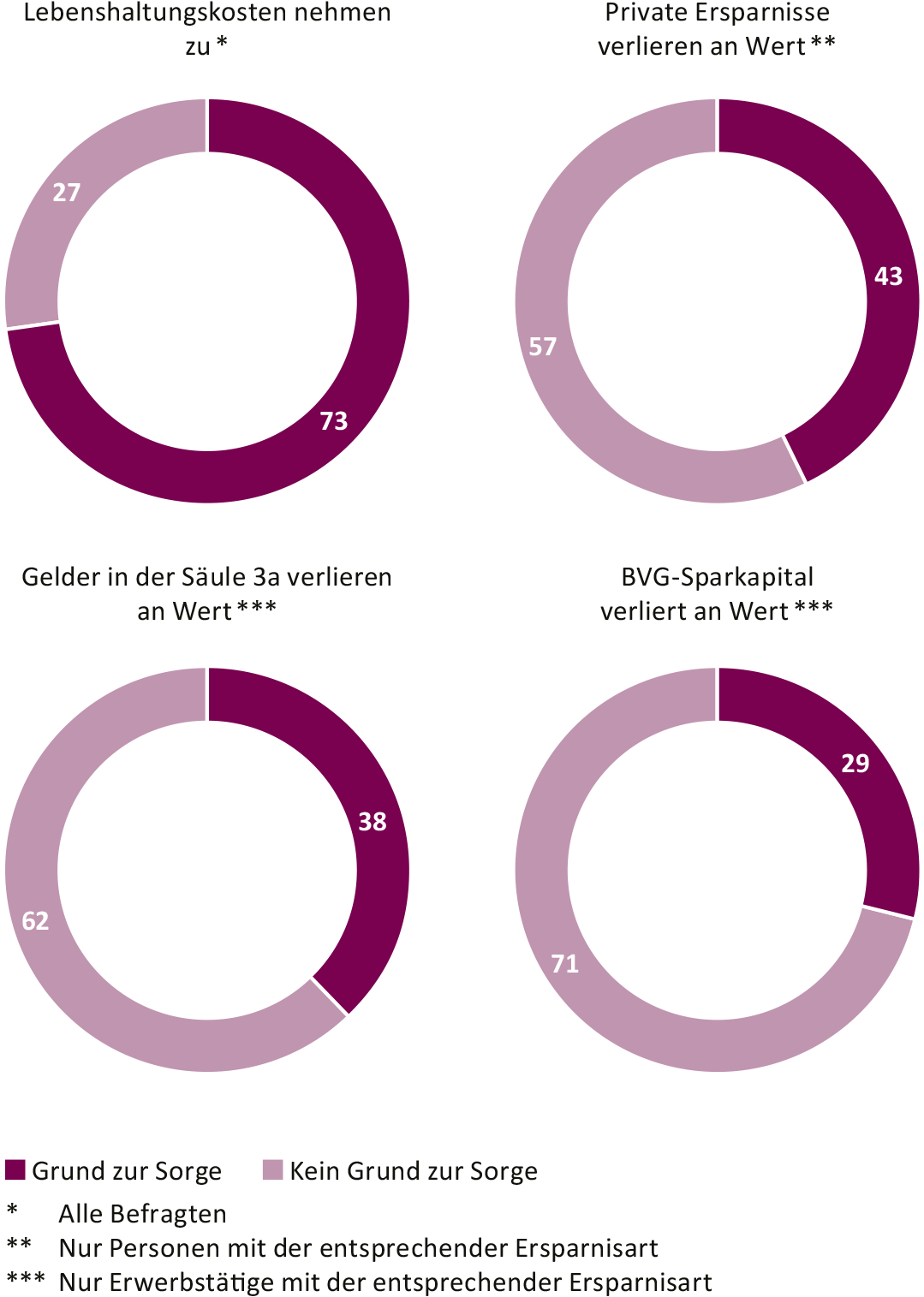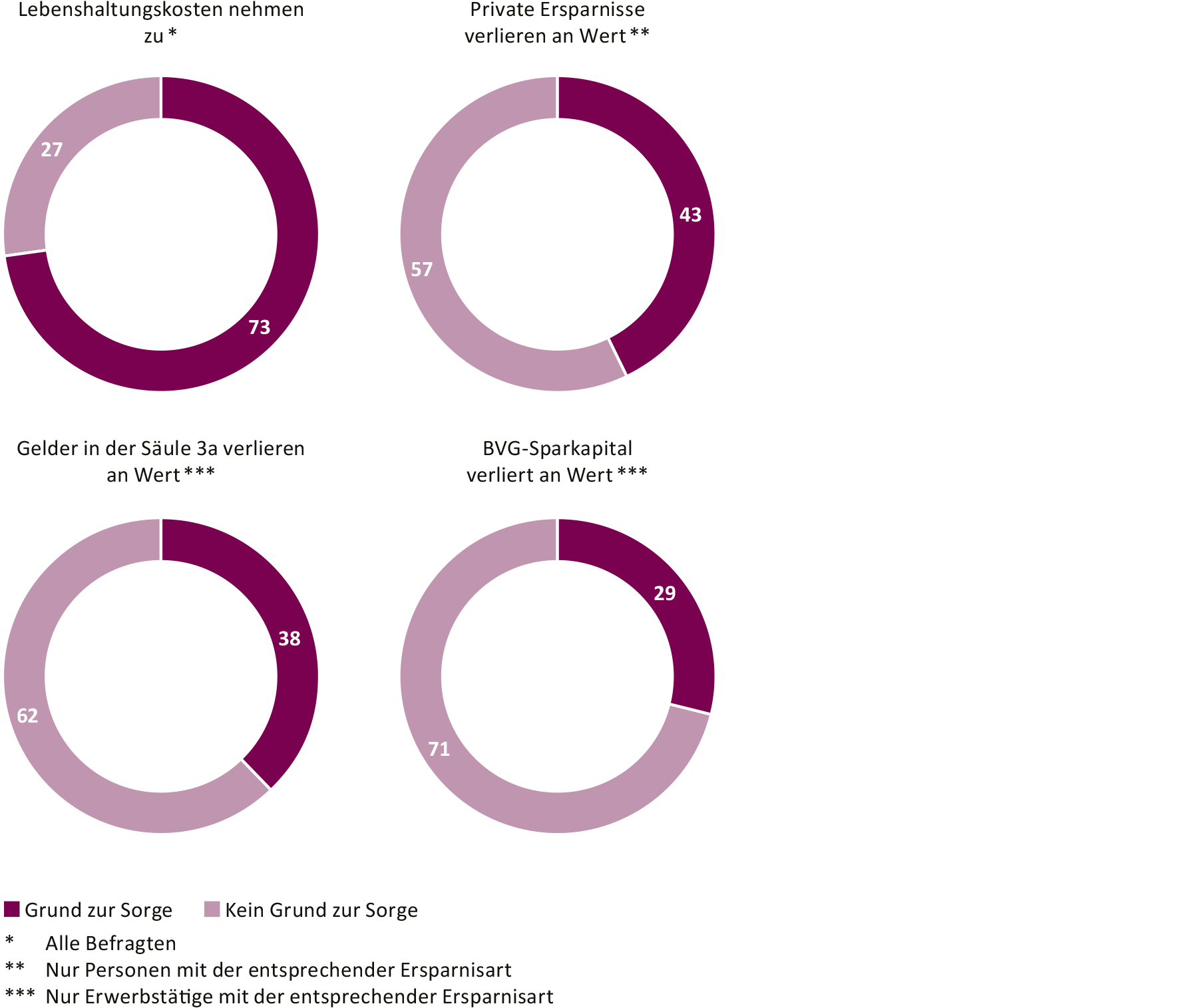 At 2.8 percent, average annual inflation in Switzerland in 2022 reached its highest point for nearly 30 years. In addition to impacting shopping, inflation also reduces the value of financial assets, e.g. savings accounts. There is little awareness of this among the population: they are considerably more concerned about the rising cost of living (73 percent) than the devaluation of their savings (43%). A meager 29 percent of the active ensured are concerned about the loss of purchasing power of their BVG capital. A contributing factor here is that the majority of those surveyed do not consider the BVG balance as part of their assets, so the connection to this important component of personal wealth is weak. This is particularly noticeable among women: women are more frequently concerned about the loss of purchasing power than men, but are less frequently concerned about the loss of the purchasing power of their BVG savings. What's more, according to the survey, they responded less frequently to inflation and reallocated their savings to investment vehicles less often.