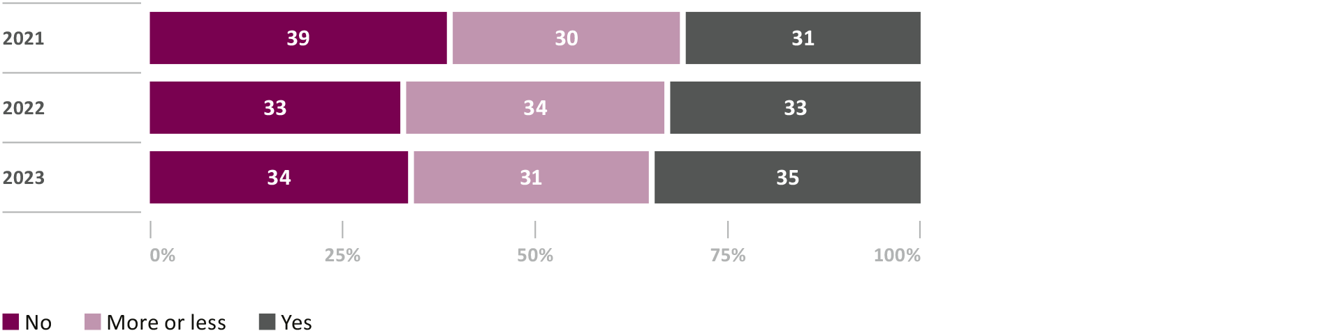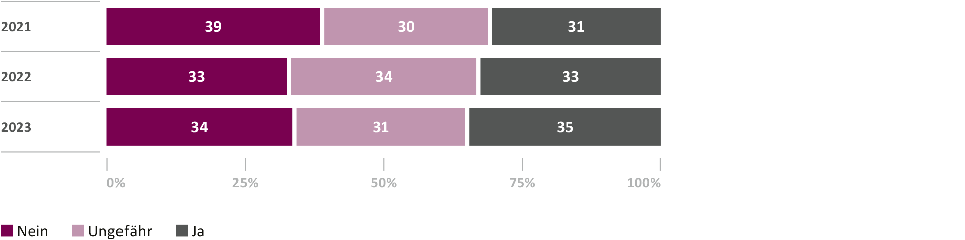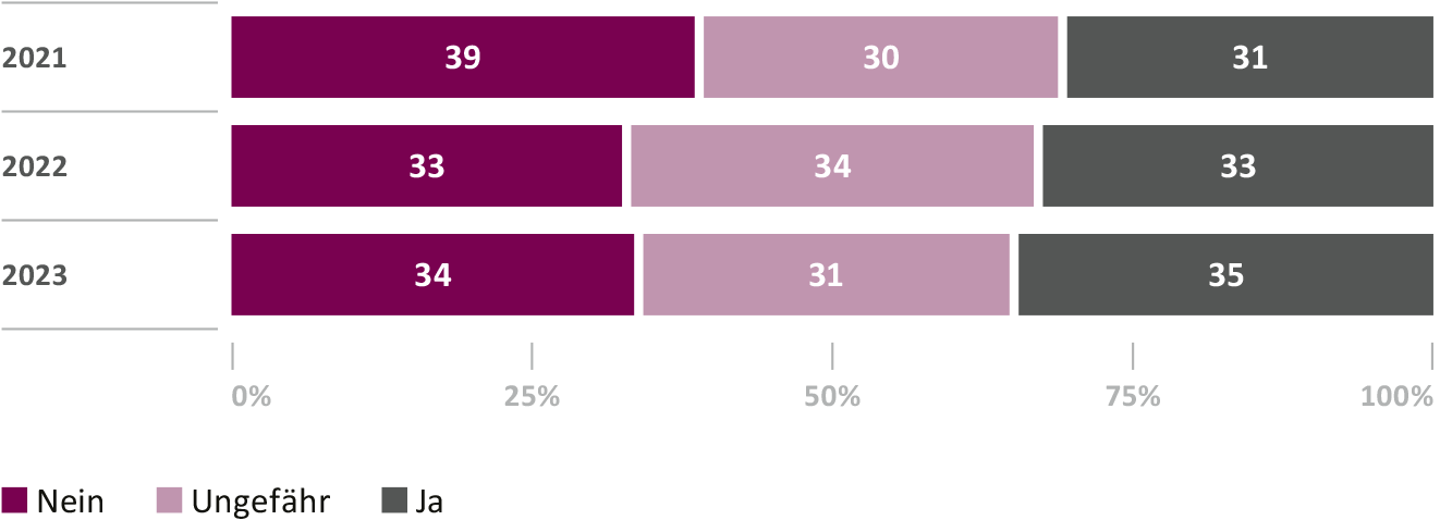 The current study also shows how important knowledge of investment opportunities and, in particular, personal experience with the topic of investing are. This knowledge is a prerequisite for understanding the function of the 2nd pillar and the ability to estimate the consequences of current inflation on retirement provision: an overwhelming majority of 87 percent would welcome it if knowledge of retirement provision and investments were part of the school curriculum. Currently, personal experience is proving to be a particularly useful source of advanced financial knowledge. Awareness of the fact that salary deductions for occupational retirement provision constitute an investment in personal retirement savings capital is growing: only 47 percent of respondents were aware of this in the 2022 survey. In this year's survey, this value has increased to 53 percent. The remainder of respondents view the contributions into the 2nd pillar as a type of tax or fee. Although awareness of this topic has improved, this has yet to translate into a meaningful impact on behavior: only a fifth of those surveyed stated that the structure of the pension fund was an important factor for them when starting a new job.