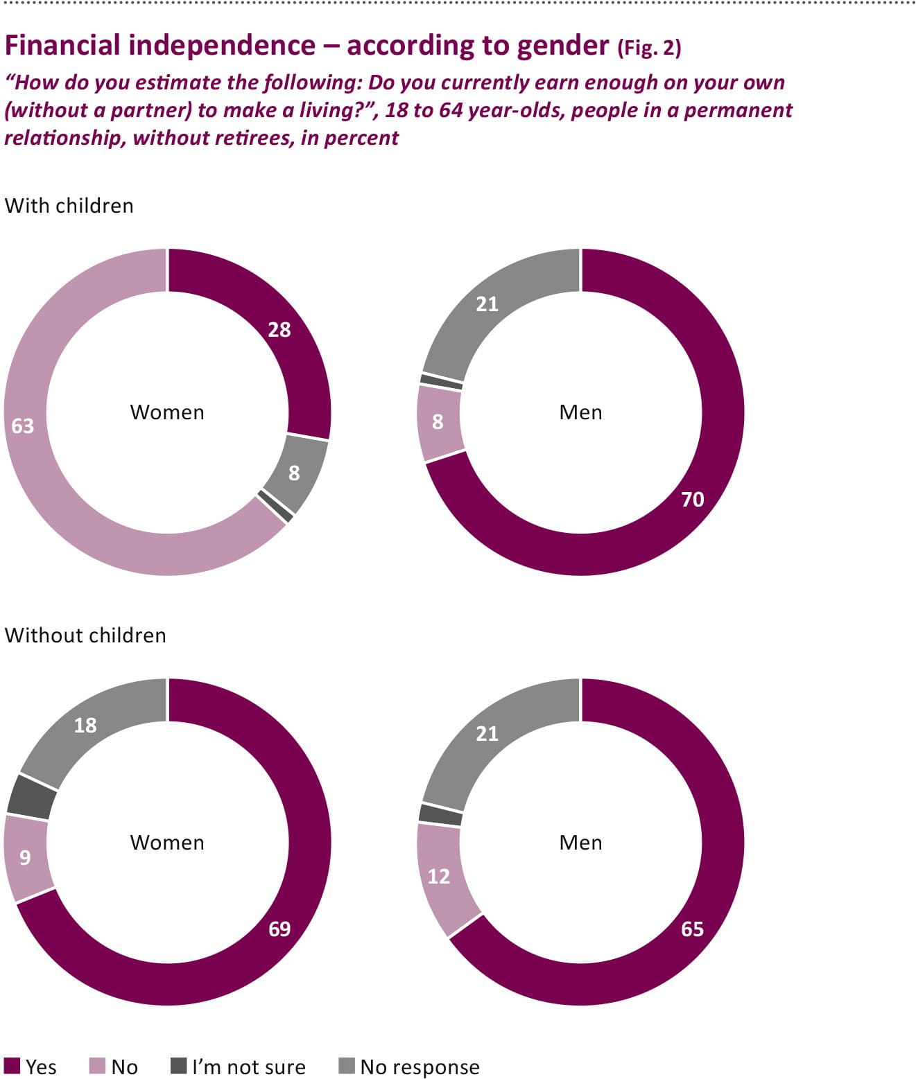 In addition, two thirds of women with children would currently not be able to stand on their own two feet with their income alone. For men and women without children, on the other hand, only around one fifth say this (see chart 2).