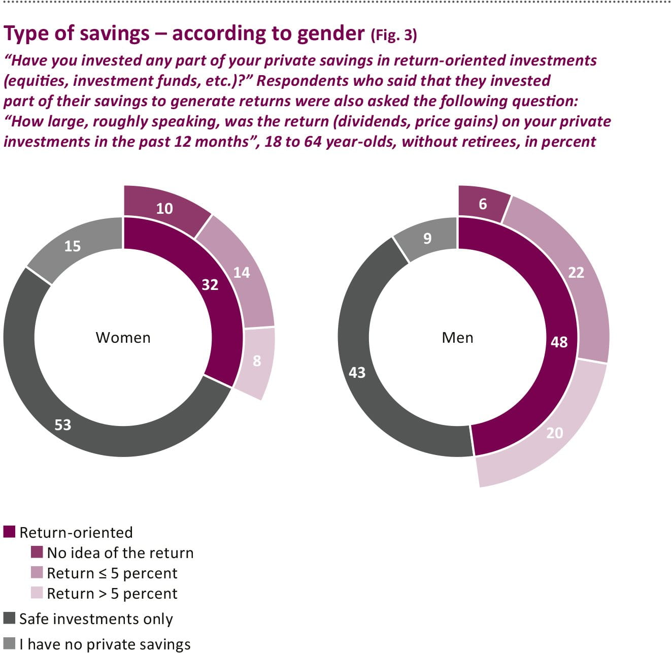 Women in particular can benefit from this information: Those interviewed for the study stated they lack the necessary investment expertise far more frequently than men, which is probably why women are more inclined to invest their savings conservatively. While as many as 48 percent of men invest their savings with a focus on returns, the figure for women is only 32 percent. Women are therefore more likely to opt for financial products that focus on preserving the value of their savings.