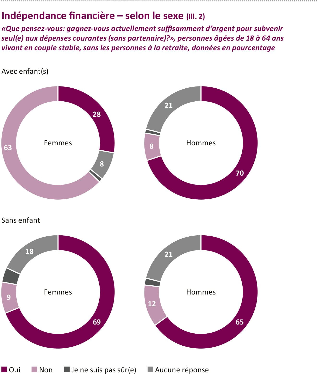 À cela s’ajoute le fait qu’actuellement deux tiers des femmes avec enfants ne pourraient pas assurer leur subsistance seules avec leur revenu. En revanche, cette proportion n’est que d’environ un cinquième chez les hommes et les femmes sans enfant (voir graphique 2).