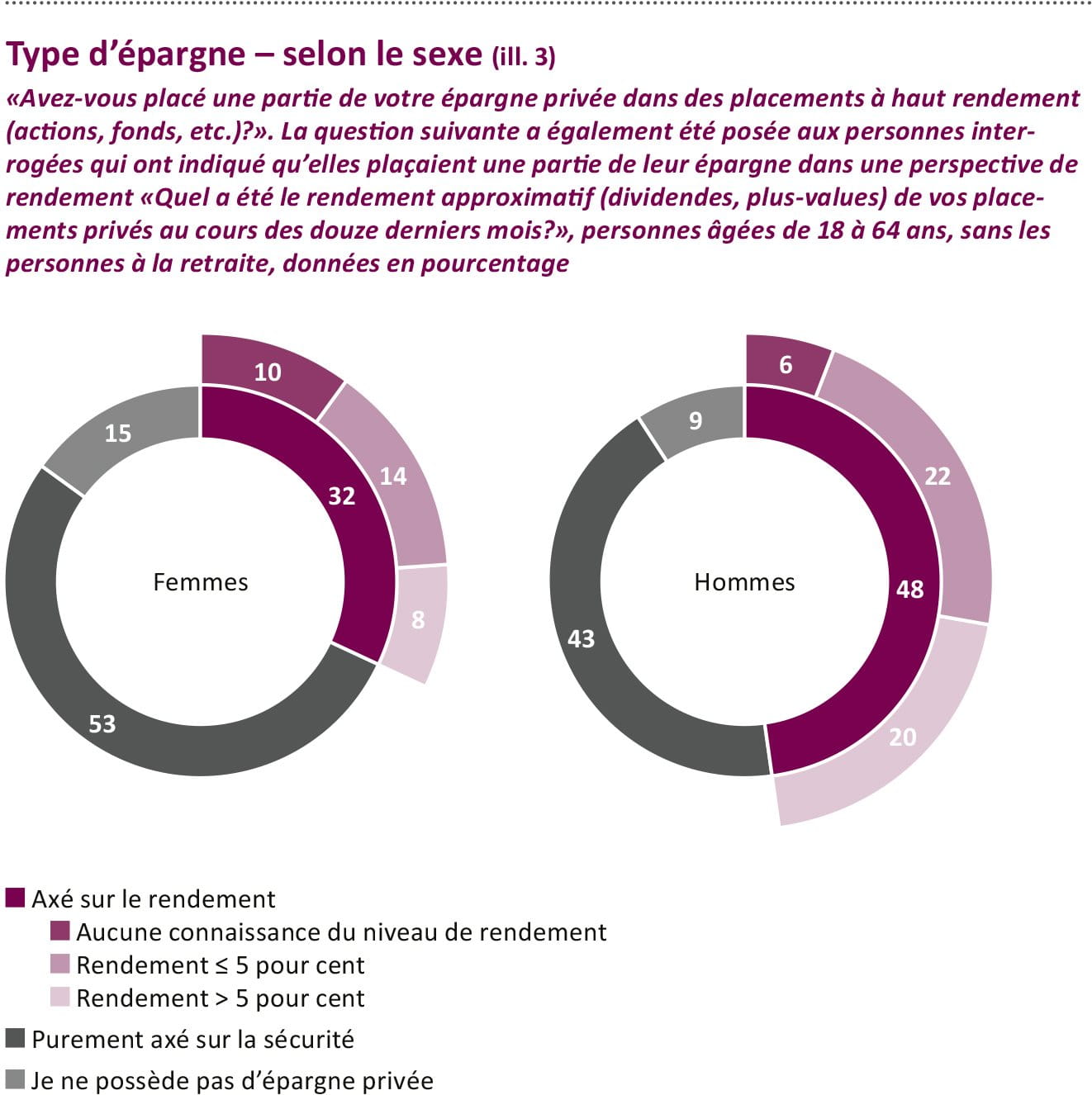 Les femmes en particulier peuvent bénéficier de telles informations. Car dans l’étude, les femmes mentionnent nettement plus souvent que les hommes qu’elles ne possèdent pas les connaissances nécessaires en matière de placement. C’est sans doute la raison pour laquelle les femmes ont davantage tendance à placer leurs épargnes de manière conservatrice. Alors que 48 pour cent des hommes placent leurs épargnes avec une perspective de rendement, ce taux n’est que de 32 pour cent pour les femmes. Les femmes misent donc plutôt sur des produits financiers axés sur la préservation de la valeur de l’épargne.